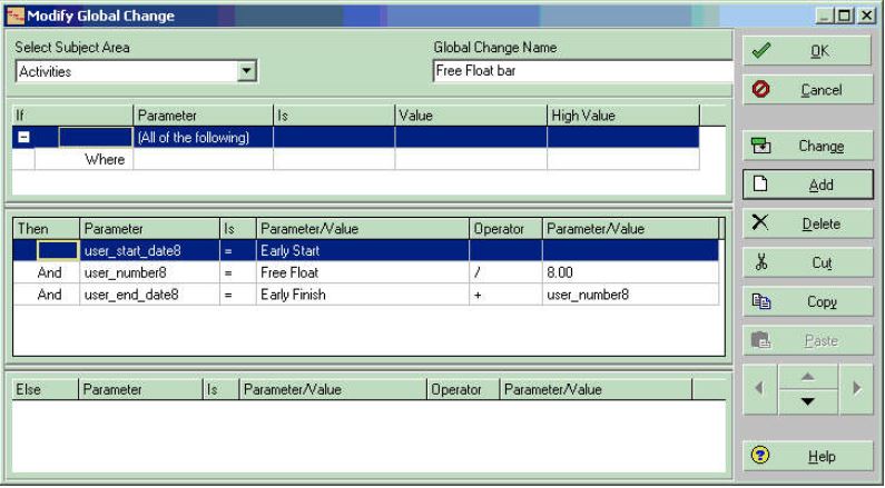 date 8' with the finish date of the activity plus the Free Float. Save this Global Change since it will need to be rerun