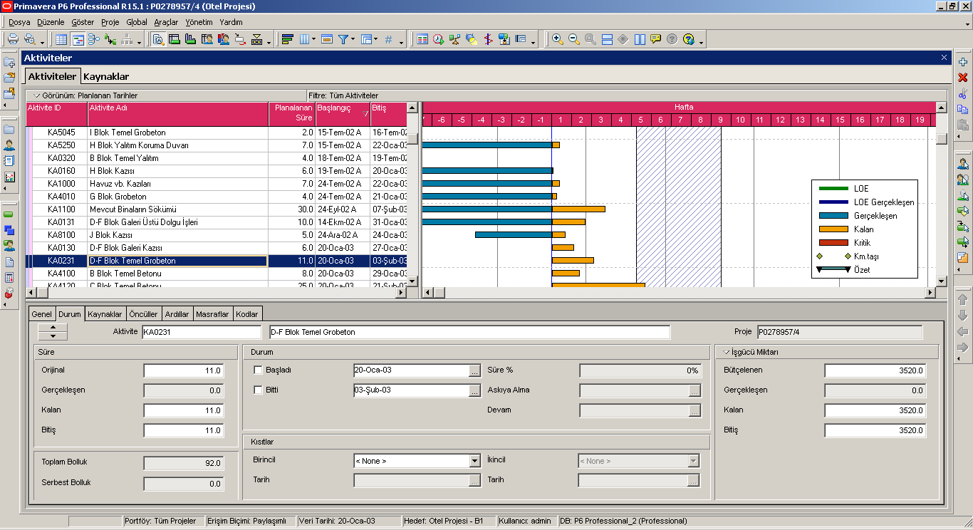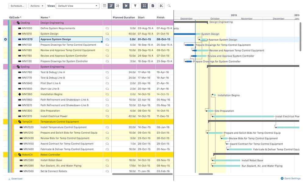 | Çizelgeleme | P6 CPM -Kritik Yol Metoduna dayalı çizelgeme algoritmasının yanısıra, kaynak dengeleme ve birden fazla bolluk yolu belirleme gibi analiz yöntemleri sunar. Projedeki gecikmeleri ve nedenlerini anlamanızı sağlayan planlar üretmenizi sağlar. |