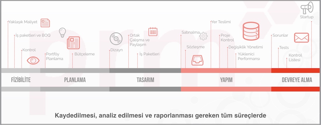 Yatırım ve tesis yönetimine yönelik süreçleri barındıran çözümlerimiz ile fizibiliteden işletmeye, uçtan uca projeleri yönetmek mümkündür.